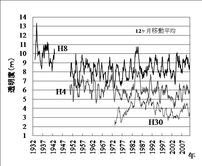 かつて「瀕死の海」と言われた瀬戸内海の環境は環境保全施策の効果によって、水質は改善されています。図3に示しますように、沿岸の影響を受けない沖合(H18)の透明度は高い値を示しており、最近は20m近い値も記録されています。