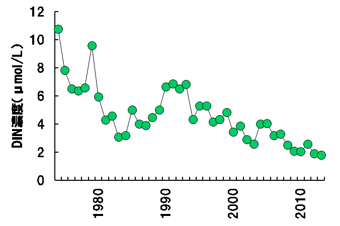 植物プランクトンが育つためには、陸上の植物と同様に栄養塩が必要であり、海の3大栄養素として無機溶存態の窒素(DIN)とリン(DIP)とケイ素(DSi)があります。これらの栄養塩のうち、瀬戸内海では特に窒素(DIN)の減少が著しく、図4に示しますように、播磨灘における濃度は1980年代の4割程度にまで減少しています。
