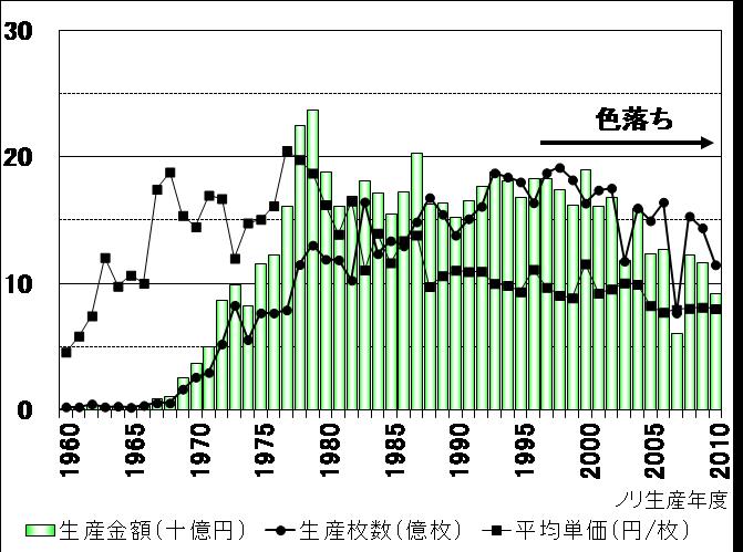 図5に示しますように、兵庫県のノリ養殖業は1970年代に急速に発展し、その生産量は1990年代中頃までは17~18億枚、170億円前後で推移していました。しかし、1990年代後半から生産枚数、生産金額ともに減少しており、現在は11~15億枚、90~120億円となっています。この減少の最大の原因は、ノリの色落ちによる品質の低下であり、水産技術センターでは、ノリ養殖時期である冬の環境調査の回数を増やしたり、ノリの品種改良に取り組んでいます。